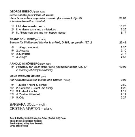 ...Auch die Geigerin Barbara Doll, seit zwei Jahren als Professorin an der Hochschule der Künste Bern und ihre Klavierpartnerin Cristina Marton setzen auf Entdeckungen. Das Debüt-Album des Duos ist zwar programmatisch weniger geschlossen (Arco Diva UP 0083-2131), doch dem Nachweis stilistischer Vielfalt genügt diese erste Visitenkarte vollauf. Zwar wirkt Georges Enescus dritte Sonate op.25 streckenweise noch zu distanziert in Rubato und Ausdruck. Aber von Schuberts a-Moll-Sonate op 137 Nr.2 an flutet der Dialog der Instrumente frei, geschmeidig und farbenreich. In Schönbergs später Fantasie für Violine mit Klavierbegleitung op.47 wird die Spannung zwischen harschem Aufbegehren und wienerischen Tanzepisoden voll ausgekostet. Im Kontrast dazu verfeinern Doll und Marton die "Fünf Nachtstücke" Henzes zu delikatem Farbenspielen...
